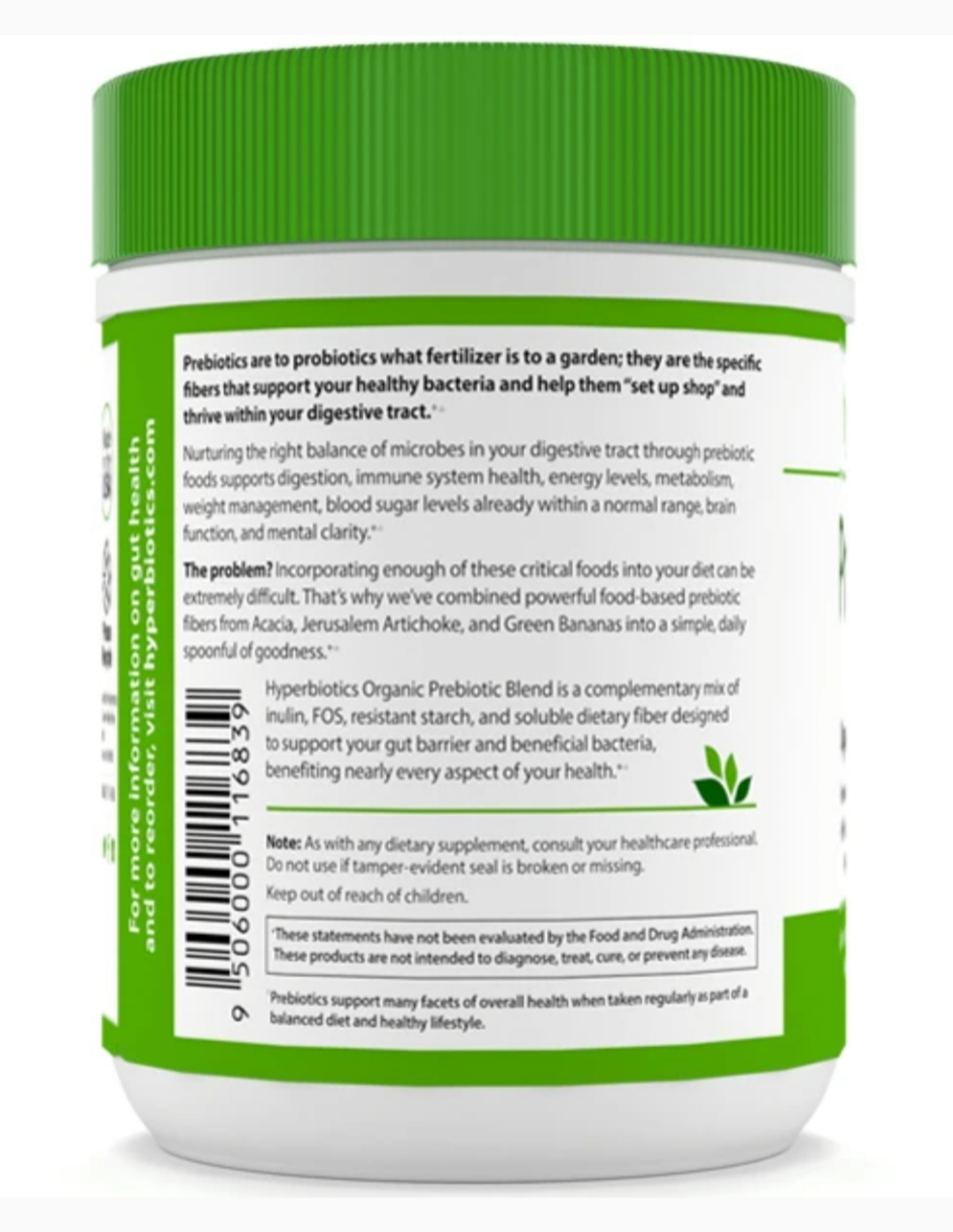 Hyperbiotics Organic Prebiotic Blend is the ideal mix of inulin, FOS, resistant starch, and soluble dietary fiber designed to support your gut barrier by supporting the growth of good bacteria.