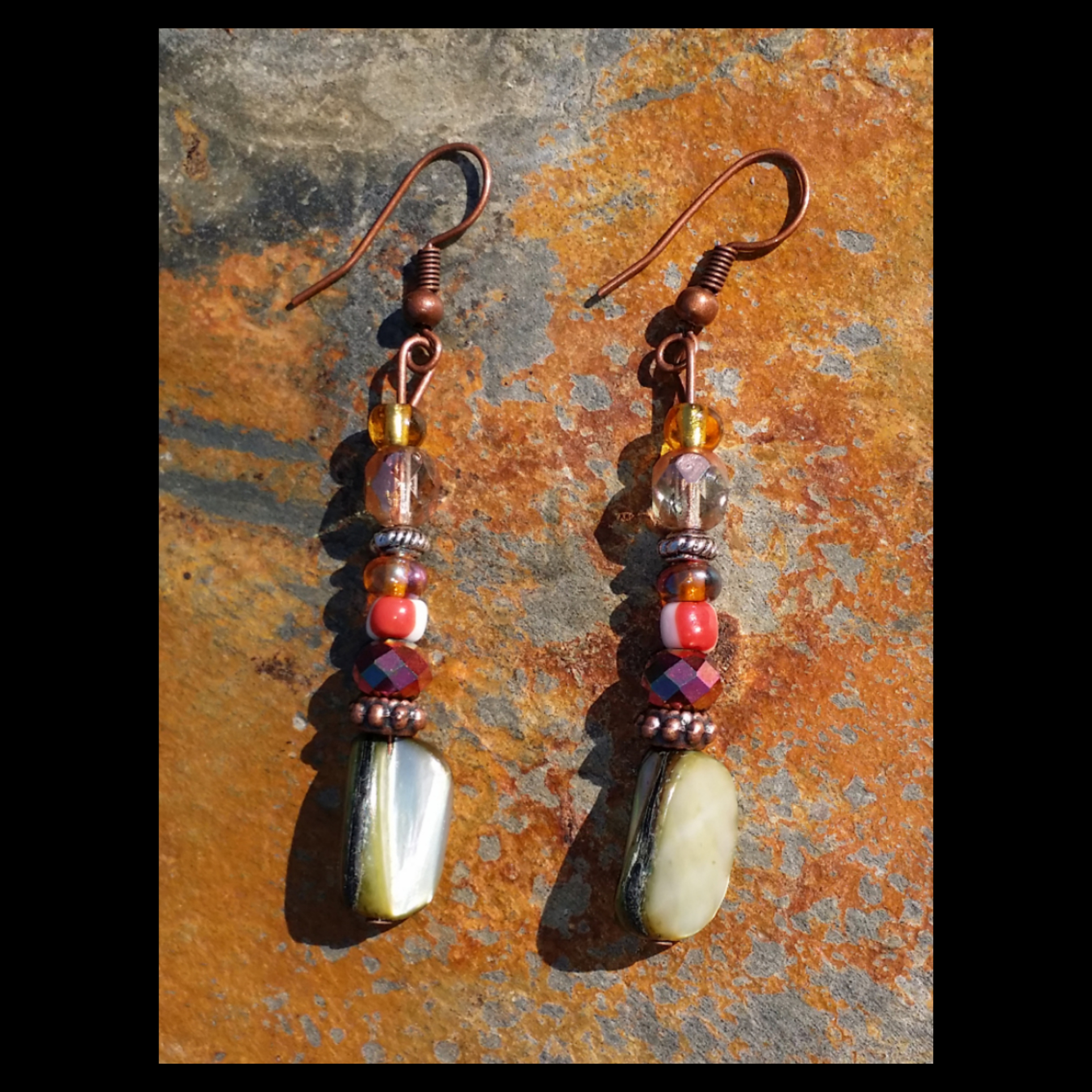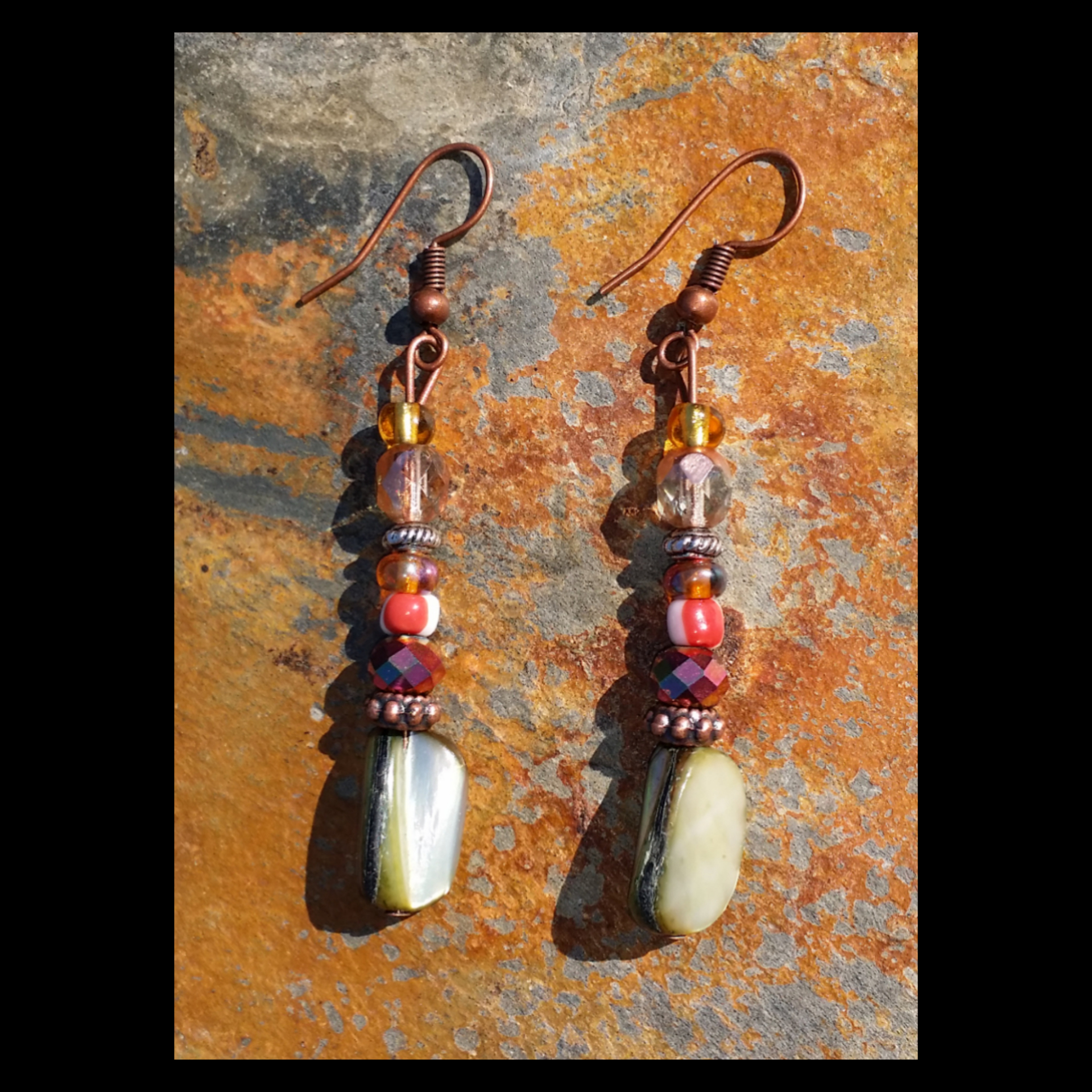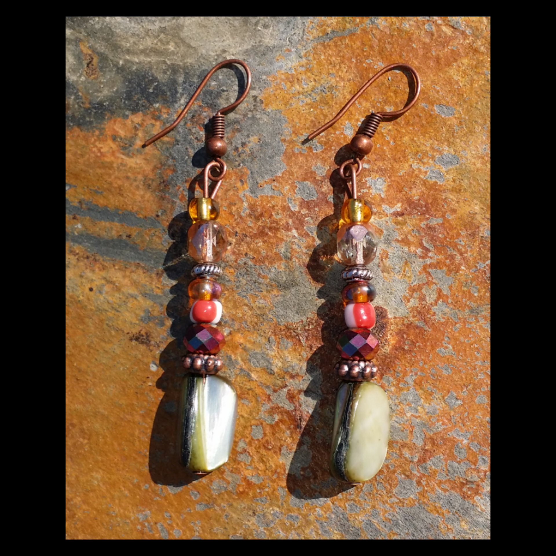 Handmade earrings adorned with Czech glass beads & various iridescent accent beads & copper tone hardware.
