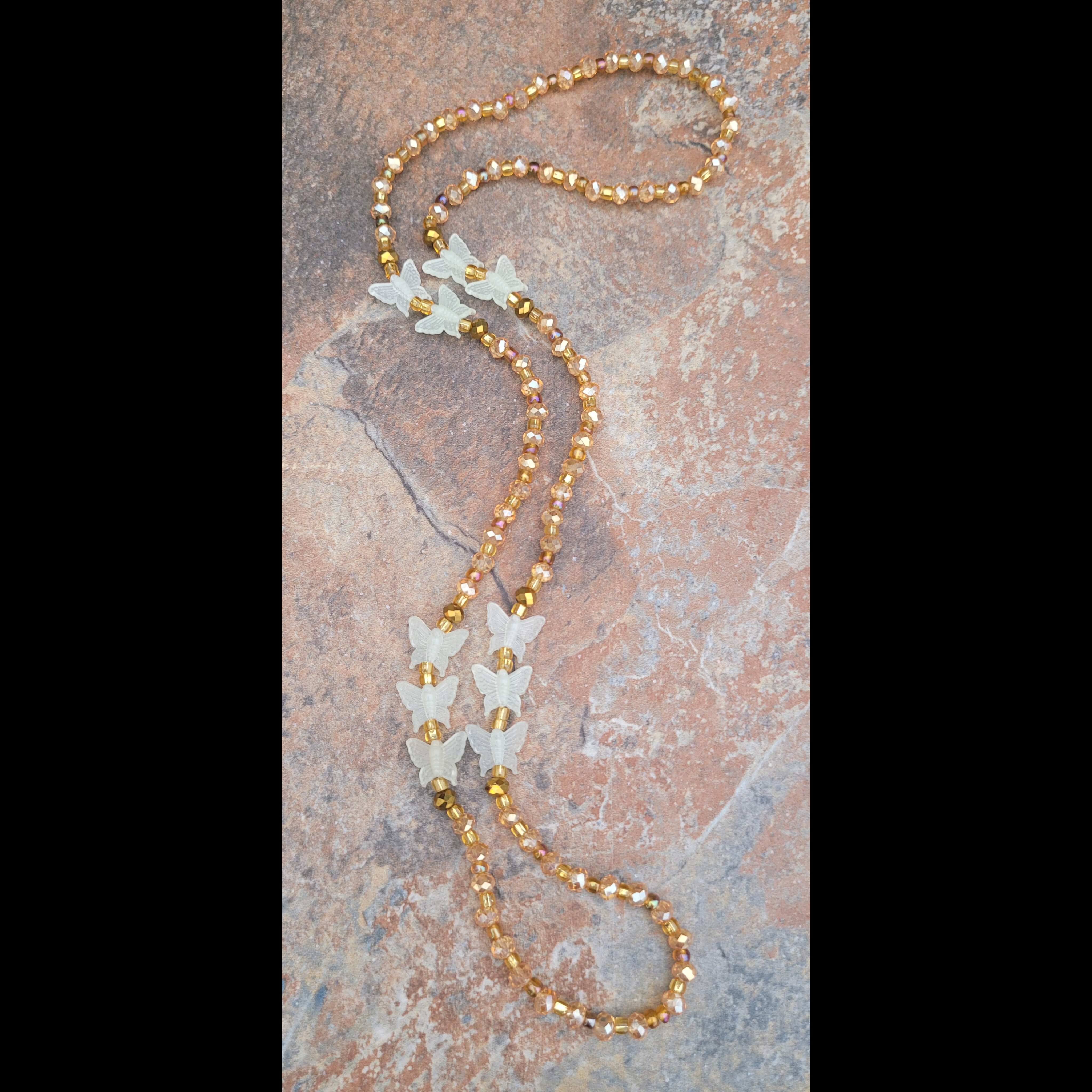 🔸️ AUTHENTIC GHANAIAN 🇬🇭 GLOW IN THE DARK RESIN BUTTERFLY 🦋 & IRIDESCENT ROSE GOLD CRYSTAL BEADS IMPORTED FROM AFRICA 🌍 - butterflies Symbolize transformation, beauty, rebirth, hope, freedom, endurance, and love 💞