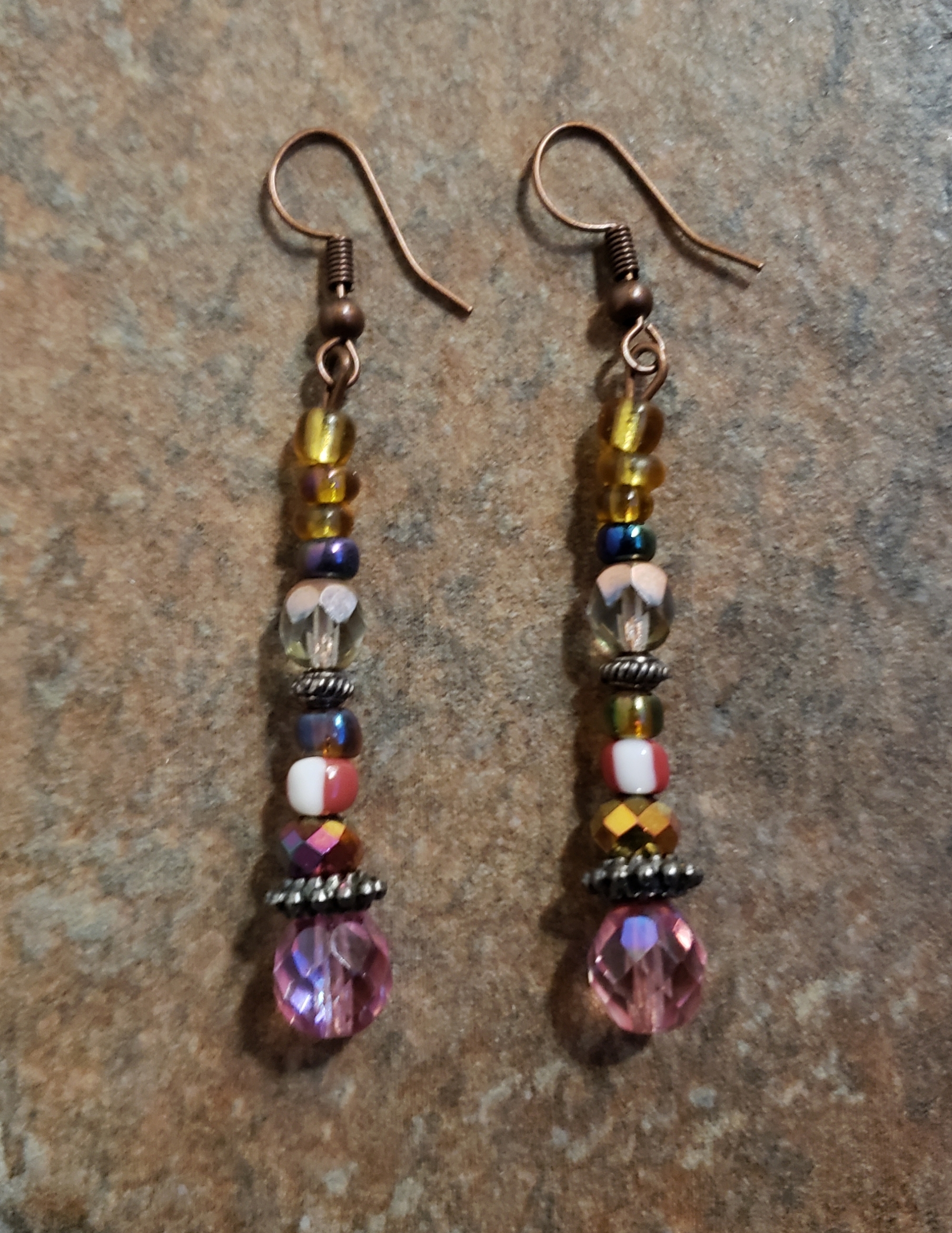Handmade earrings adorned with Czech glass beads, various iridescent accent beads & copper tone hardware.