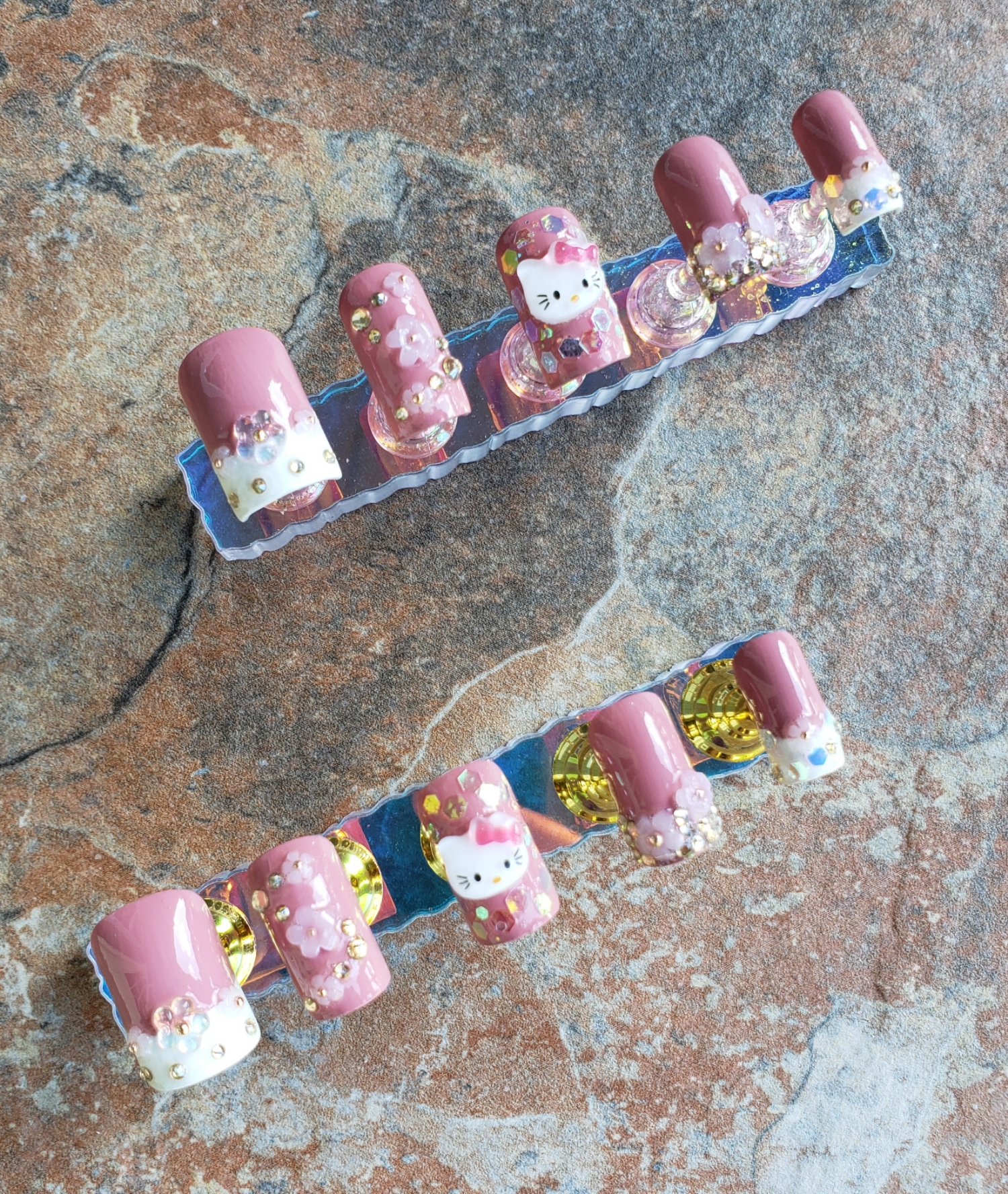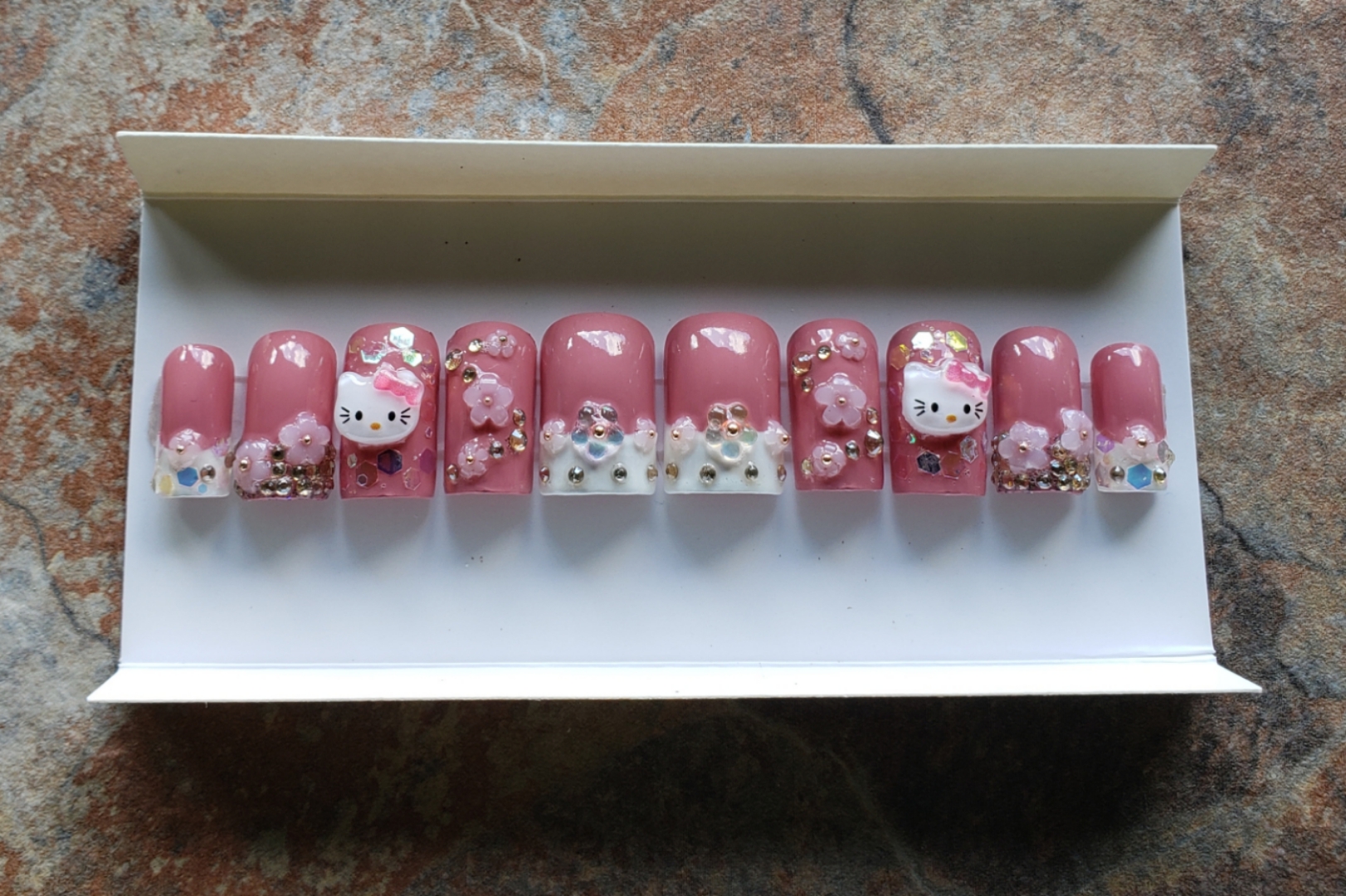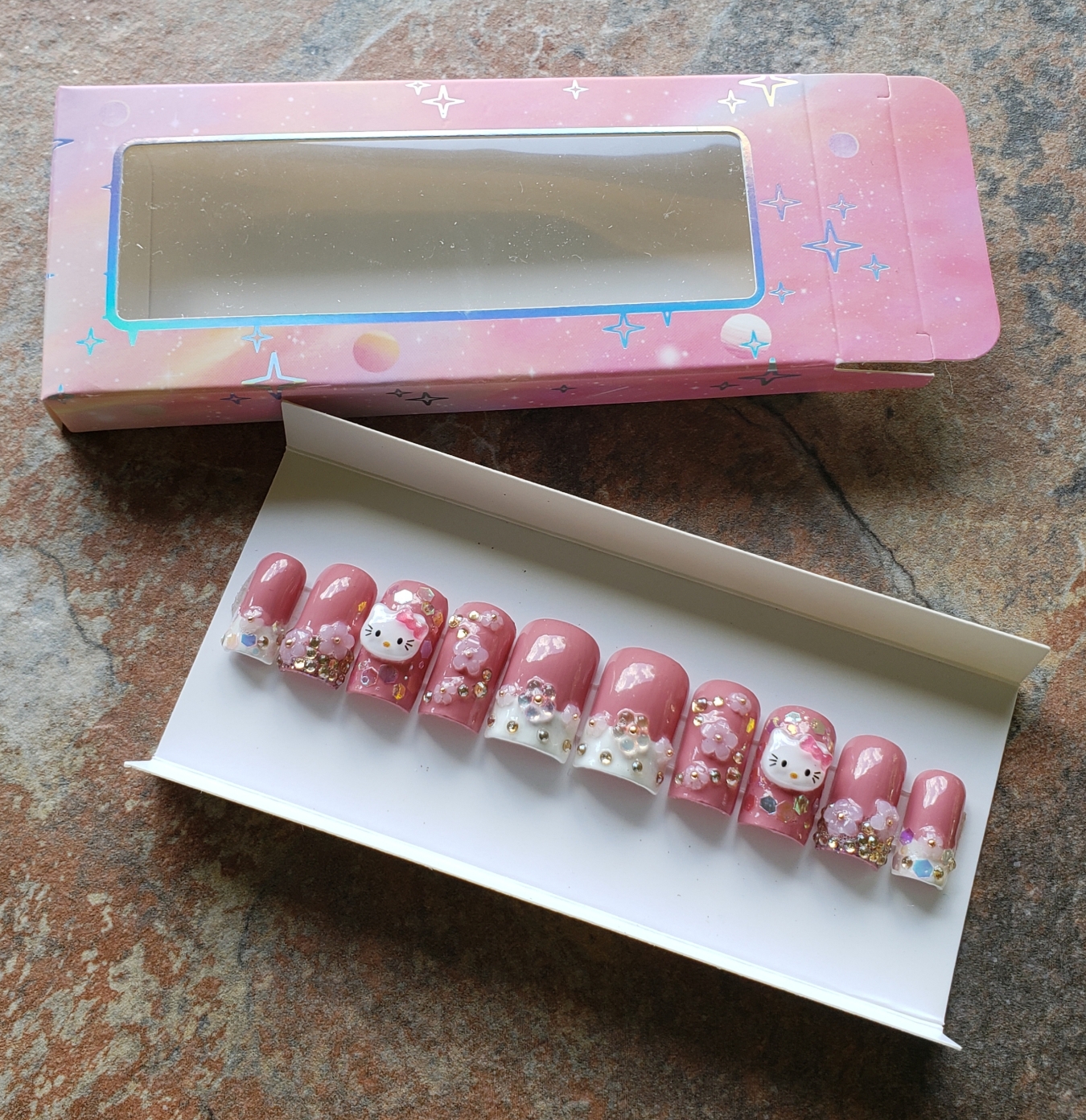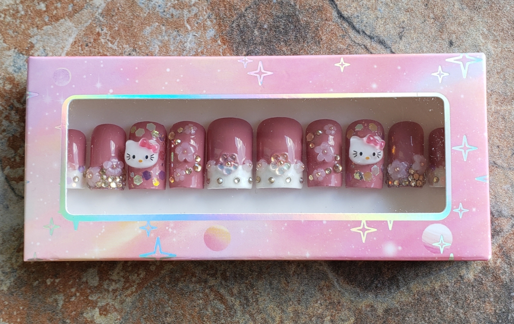 These are PRESS-ONS but they LOOK, FEEL & LAST (2-3 WEEKS) like the REAL DEAL! They are HAND PAINTED with SOPHI NON-TOXIC WATER BASED NAIL POLISH COLOR "MI AMORE"๐ & ADORNED WITH AUTHENTIC CRYSTAL RHINESTONES, FLORAL ACCENTS & HELLO KITTY CHARMS๐บ๐ธ