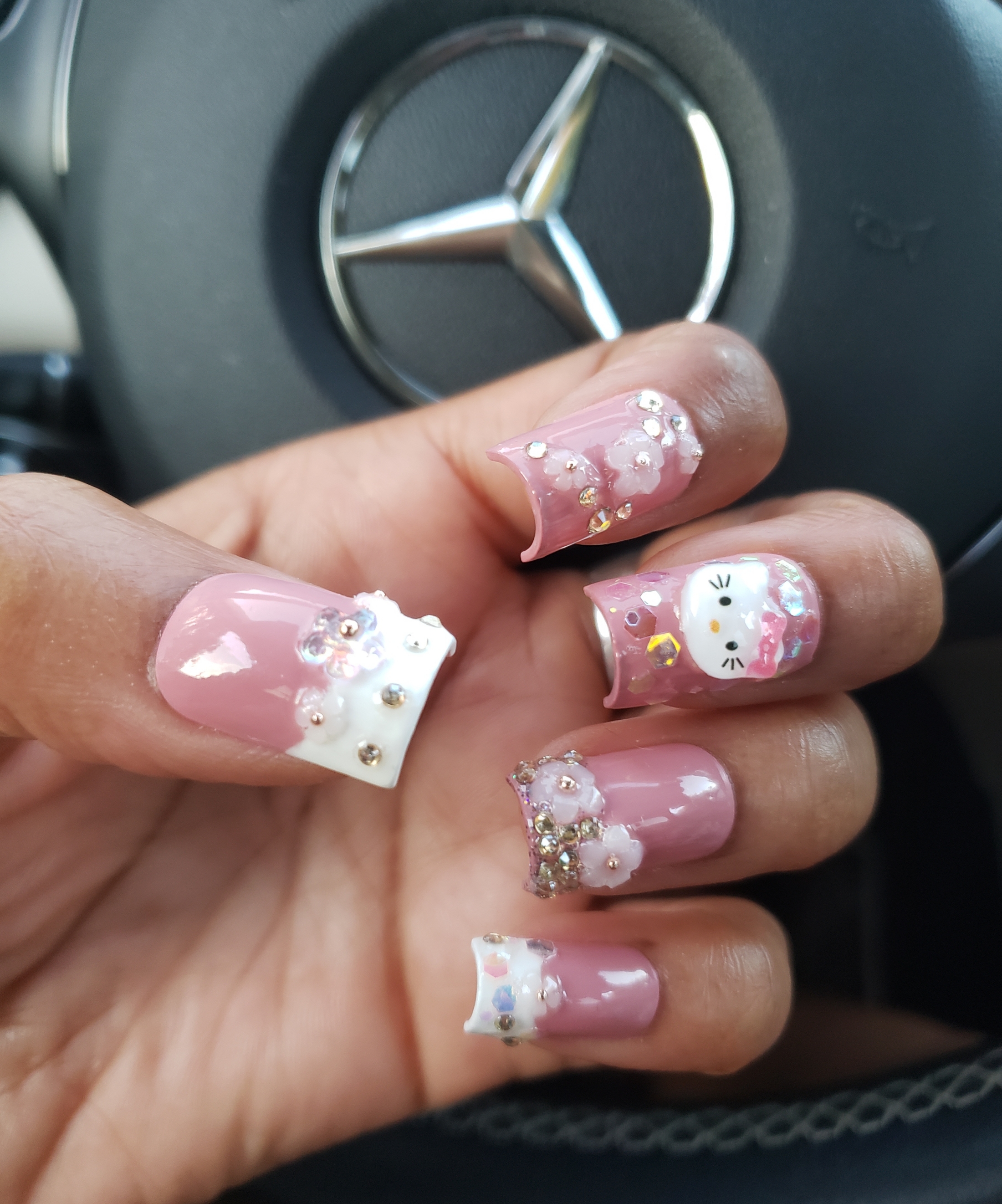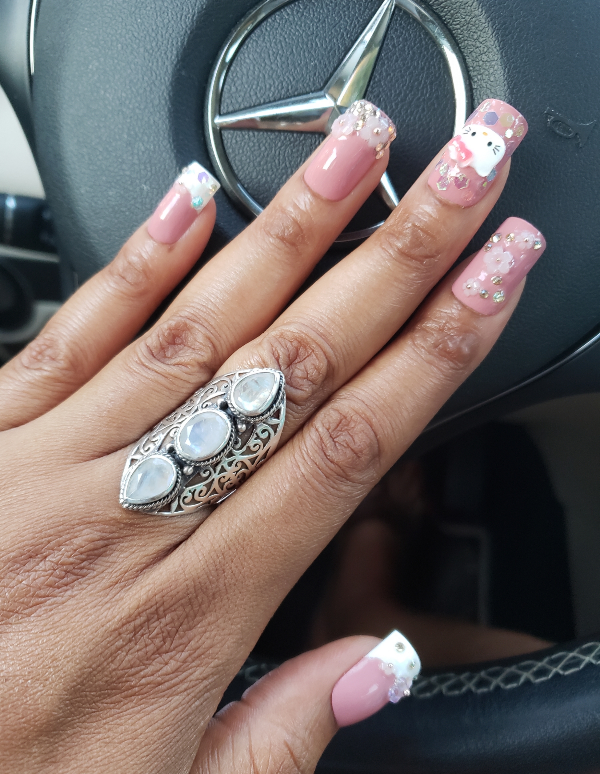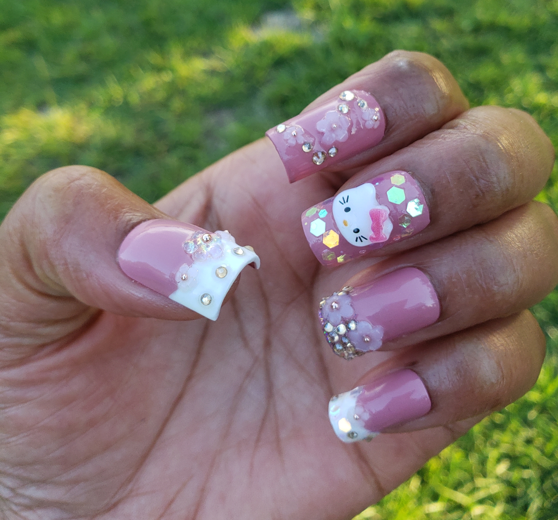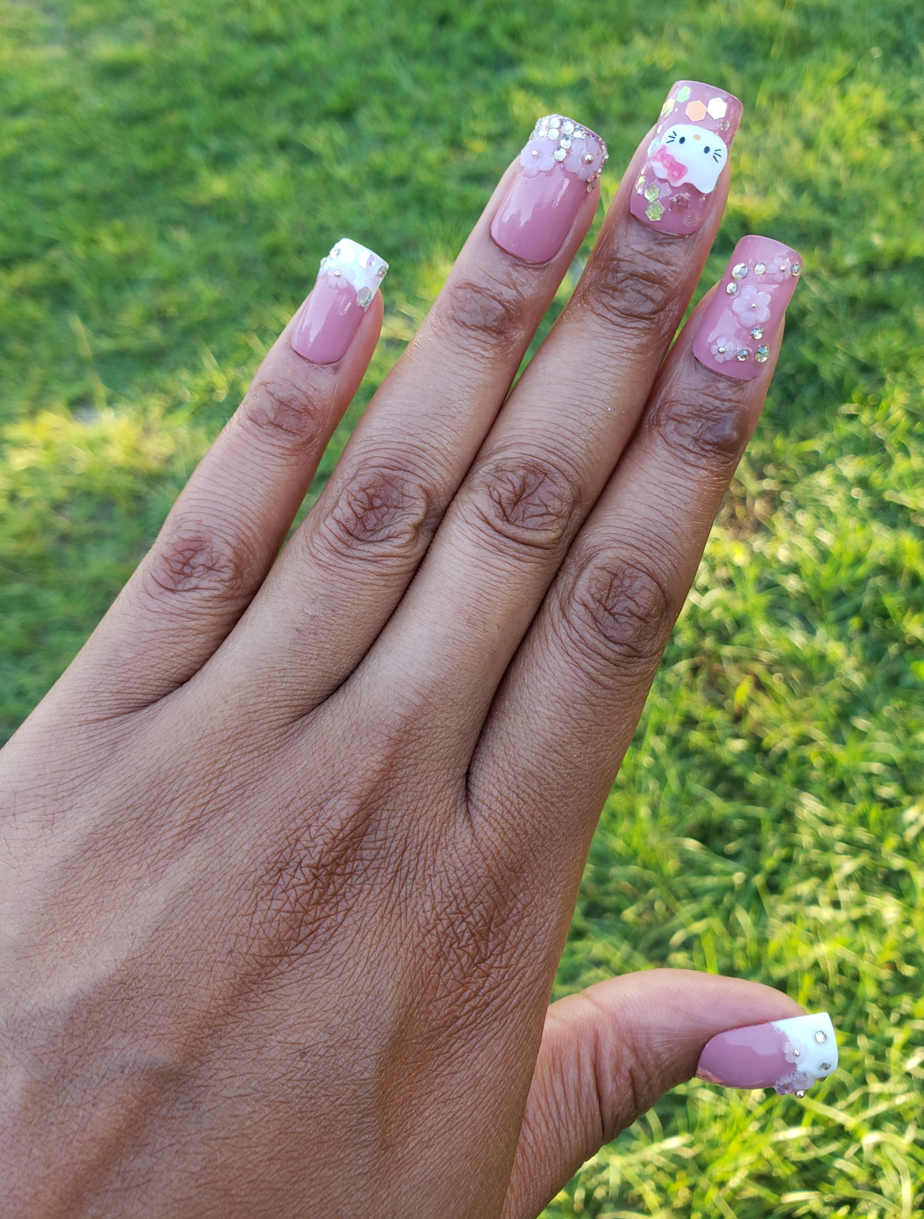 These are PRESS-ONS but they LOOK, FEEL & LAST (2-3 WEEKS) like the REAL DEAL! They are HAND PAINTED with SOPHI NON-TOXIC WATER BASED NAIL POLISH COLOR "MI AMORE"๐ & ADORNED WITH AUTHENTIC CRYSTAL RHINESTONES, FLORAL ACCENTS & HELLO KITTY CHARMS๐บ๐ธ